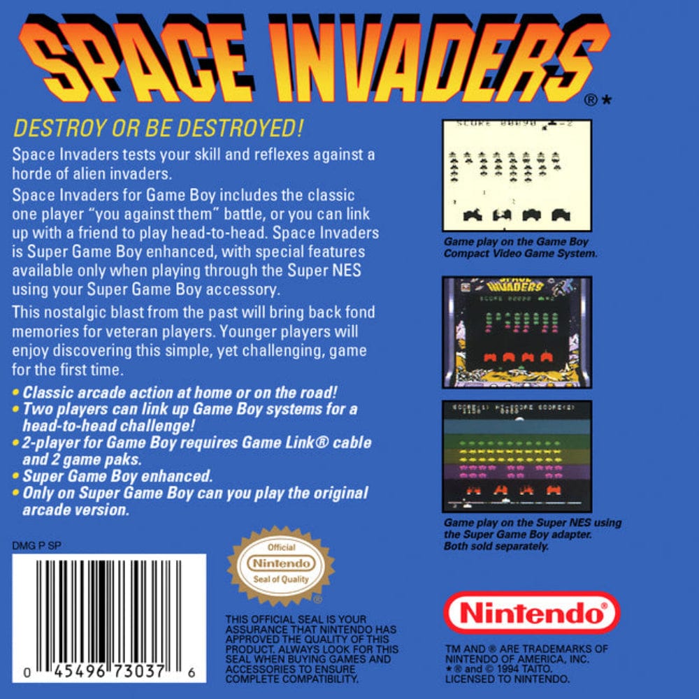 DescriptionSpace Invaders for Game Boy challenges you to sharpen your skills and reflexes as you face endless waves of alien invaders. Enjoy the classic solo mode or link up with a friend for thrilling head-to-head battles. This version is Super Game Boy Enhanced, offering exclusive features when played on a Super NES with the Super Game Boy accessory. Whether revisiting a timeless classic or exploring it for the first time, players of all ages will find the engaging gameplay both nostalgic and captivating. Dive into this iconic arcade experience and defend Earth from the extraterrestrial threat! |