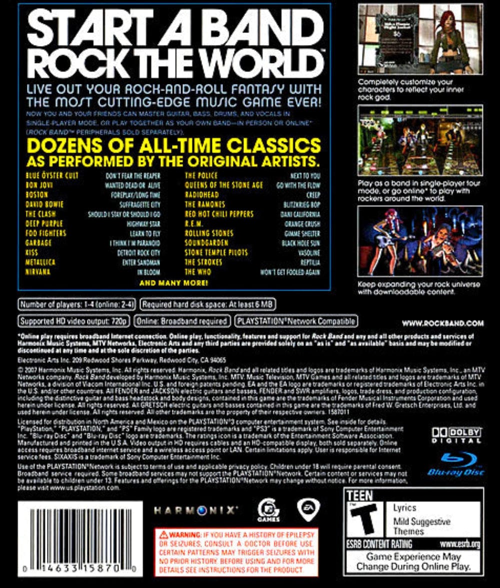 Rock Band for PlayStation 3 lets you and your friends form a virtual band using drums, guitar, bass, and microphone controllers. Play authentic recordings from rock's greatest artists across all genres, then compete online with players worldwide. It's the ultimate multiplayer music experience.