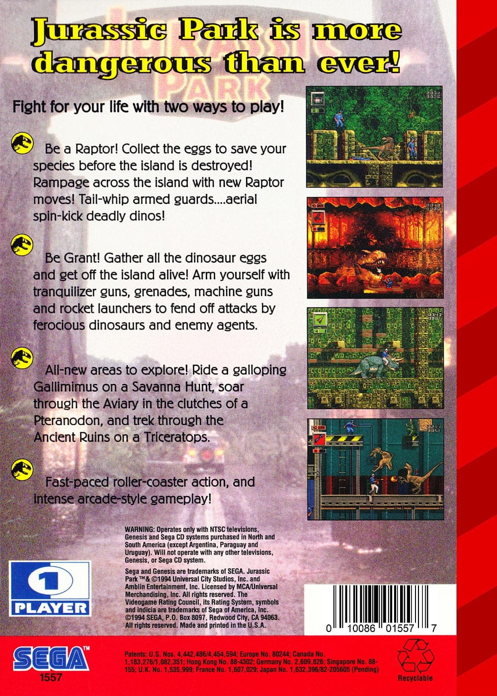DescriptionExperience the ultimate dinosaur showdown in this high-octane Sega Genesis classic. Choose your path: command Dr. Grant's firepower through intense, relentless stages, or unleash primal fury as a cunning Raptor locked in deadly combat with the island's apex predator. Every decision matters as you navigate treacherous terrain and face escalating threats. The stakes are simple but brutal—survive the chaos and flee before the island's destruction consumes everything. Faster, deadlier, and more thrilling than ever, this Rampage Edition demands quick reflexes and strategic thinking. Will you make it off alive? |